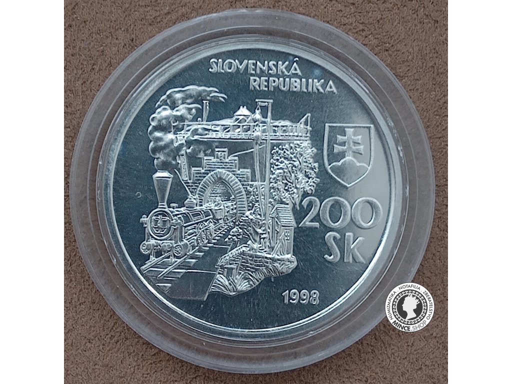 Železničná trať Marchegg-Bratislava, vybudovaná v rokoch 1844 - 1848, bola prvou traťou s parnou prevádzkou na území Slovenska, ako aj celého bývalého Uhorska. Pri jej výstavbe bol vybudovaný najdlhší železničný most na rieke Morave (476 m) a jeden z prvých dlhších tunelov v Európe (703,6 m). Na zabezpečenie riadenia dopravy medzi Gänserndorfom a Bratislavou bolo zriadené prvé telegrafné spojenie na Slovensku. Prvý vlak ťahaný parným rušňom prišiel do Bratislavy 20. augusta 1848. Otvorenie tejto železničnej trate položilo základy vzniku železníc na Slovensku a vytvorilo podmienky na spojenie Bratislavy s celým budúcim železničným systémom v Európe. Lícna strana: Na líci mince je zobrazený dobový parný vlak, ktorý vychádza z bratislavského železničného tunela. Nad tunelom je uvedený názov štátu SLOVENSKÁ REPUBLIKA, pri pravom okraji mince je štátny znak, nominálna hodnota mince 200 Sk a letopočet razby 1998. Rubová strana: Na rube mince je zobrazený typ parného rušňa, ktorý doviezol do Bratislavy prvý parný vlak a dobový pohľad na bratislavský hrad s podhradím. Pri hornom okraji mince je uvedený text PRVÝ PARNÝ VLAK NA SLOVENSKU a letopočty 1848 - 1998.