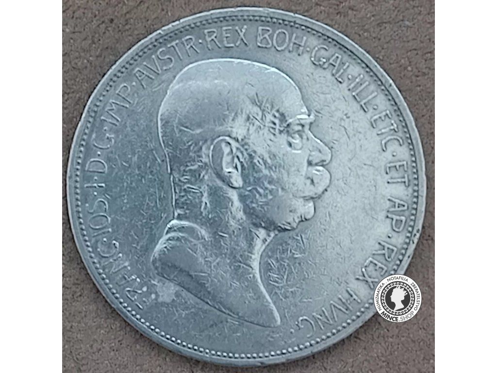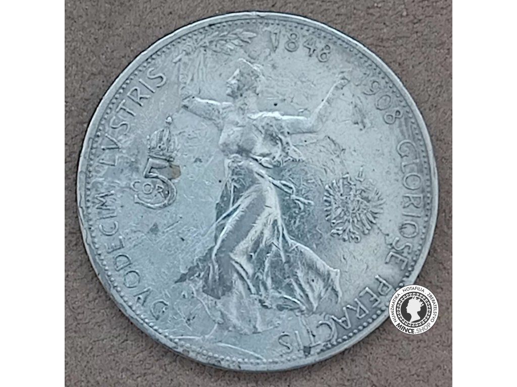 Strieborná historická pamätná minca minca v hodnote 5.korún z roku 1908 vydaná pri príležitosti 60.výročia vlády panovníka František Jozefa I., Rakúsko-Uhorsko
