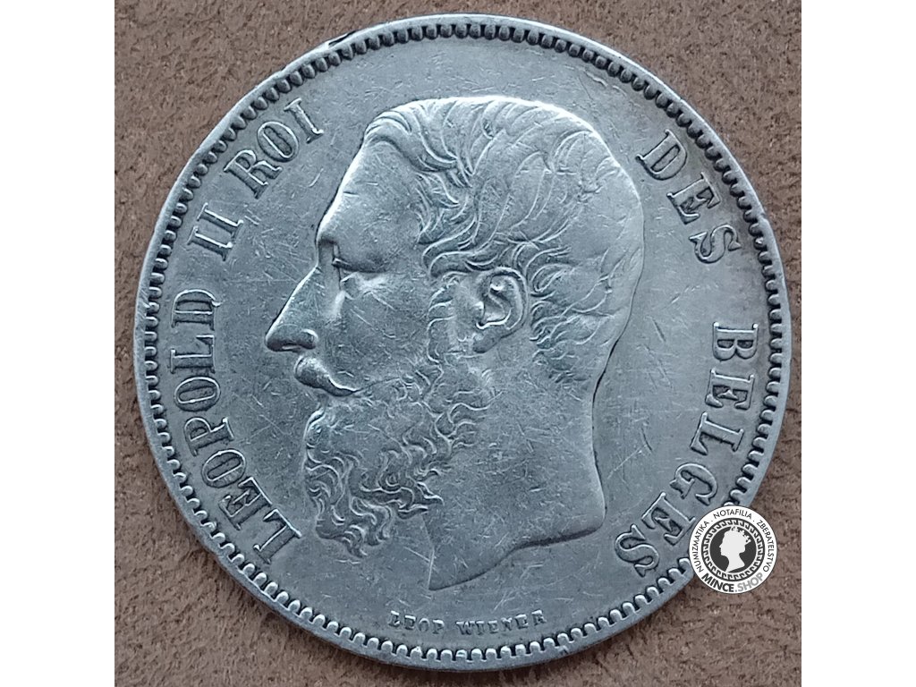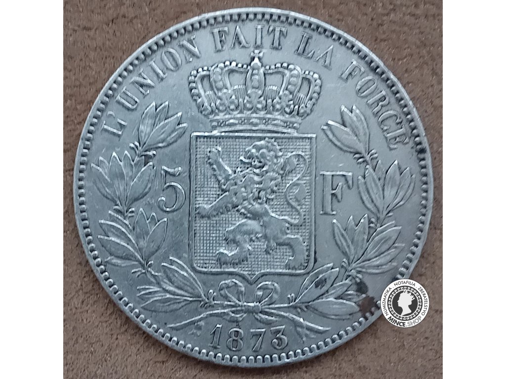Historická strieborná obehová minca v hodnote 5 frankov z roku 1873, Leopold II., Belgicko