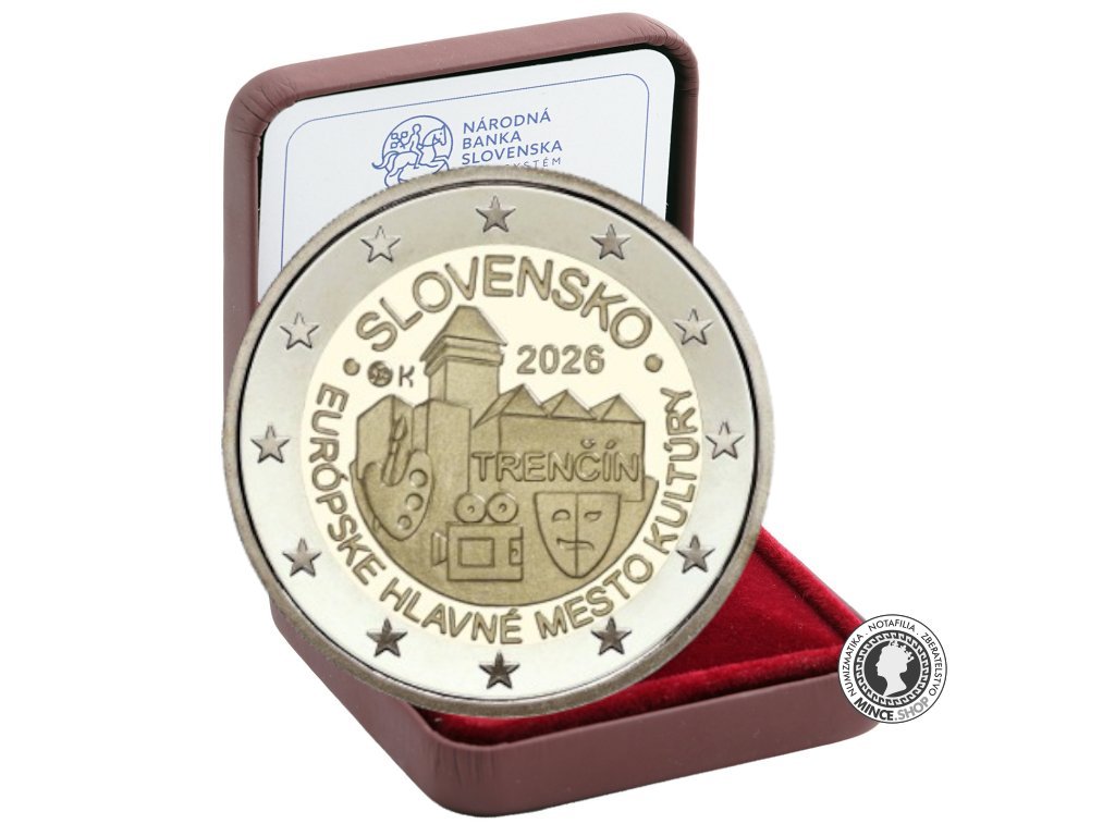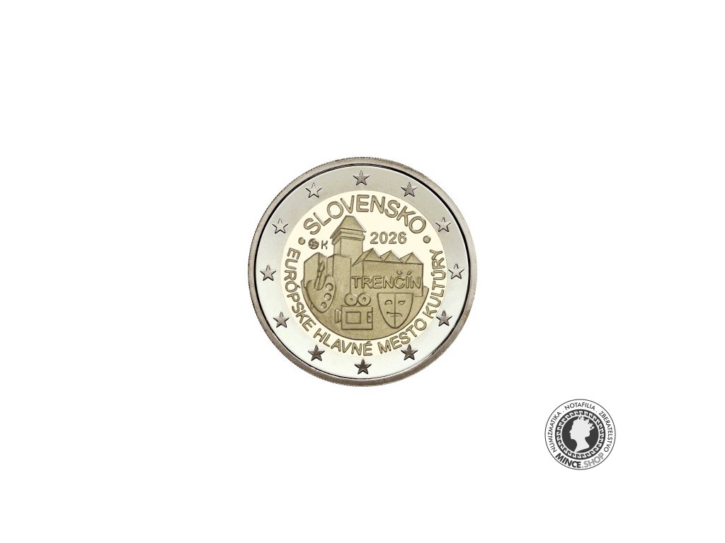 Pamätná 2€ minca vo vyhotovení proof like s ročníkom razby 2026 vydaná k udalosti Trenčín – Európske hlavné mesto kultúry 2026.
