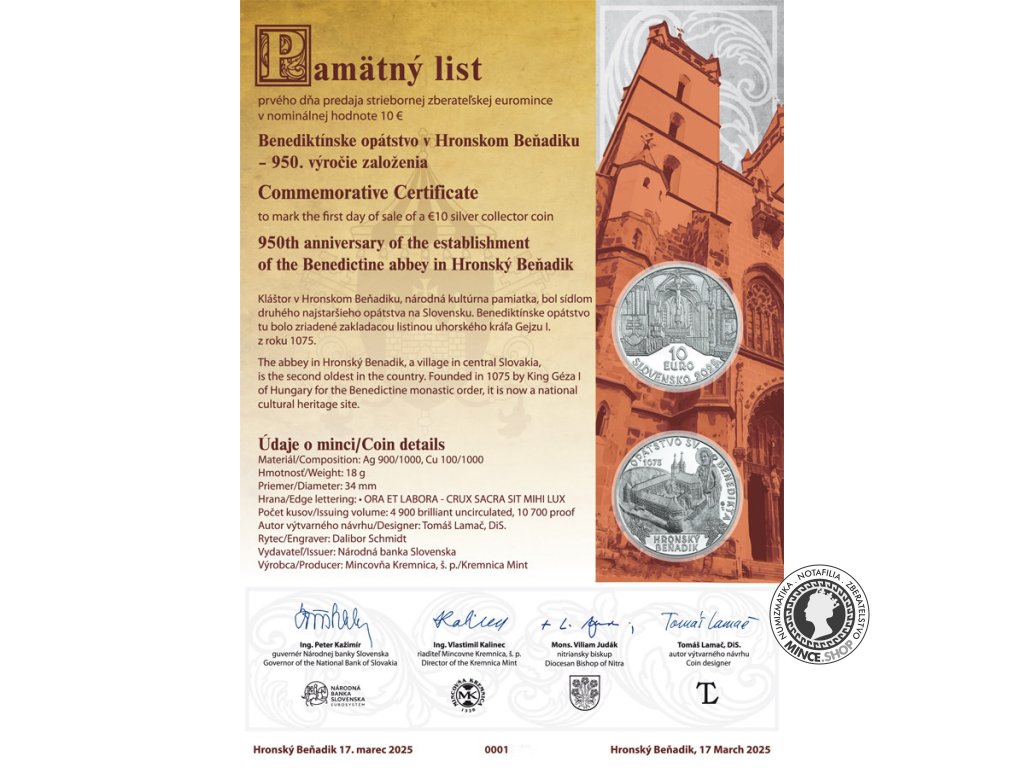 Pamätný list 10€ (2025) - Benediktínske opátstvo v Hronskom Beňadiku - 950.výročie