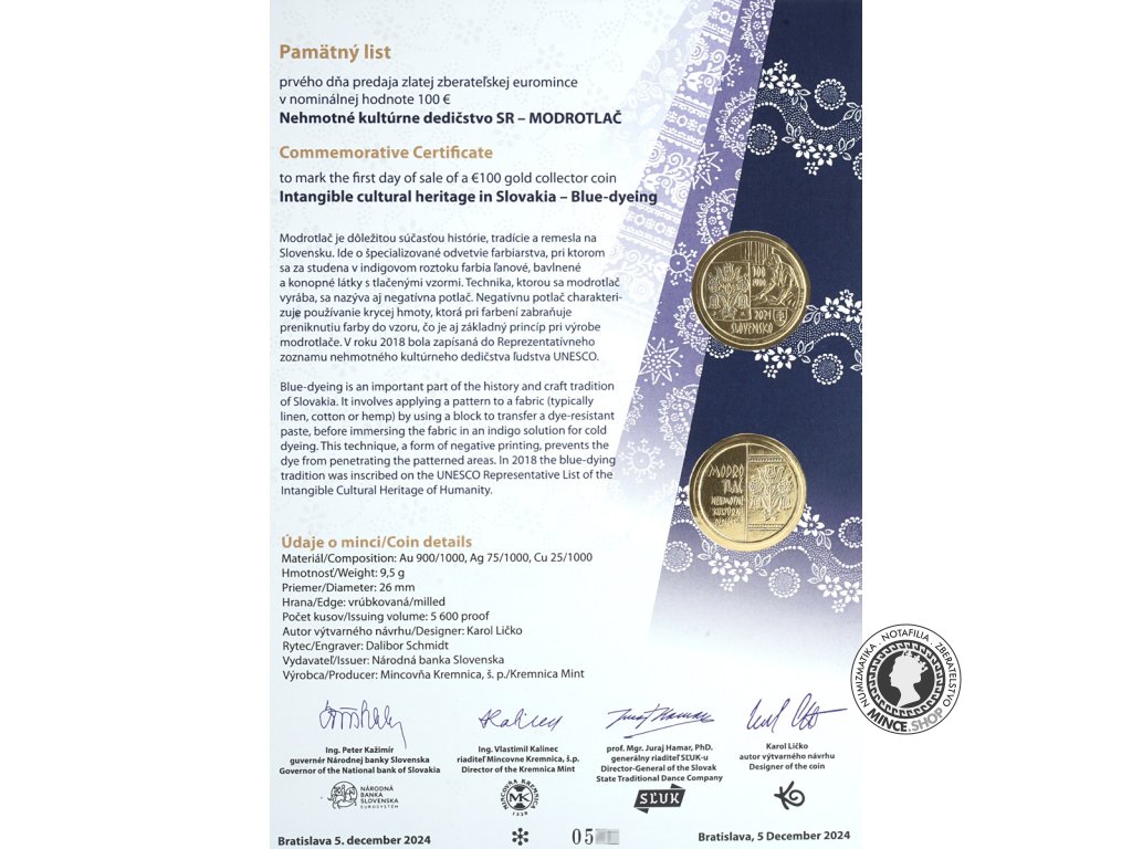 Pamätný list prvého dňa predaja zlatej zberateľskej mince nominálnej hodnoty 100 euro s motívom ''Nehmotné kultúrne dedičstvo SR - MODROTLAČ''.