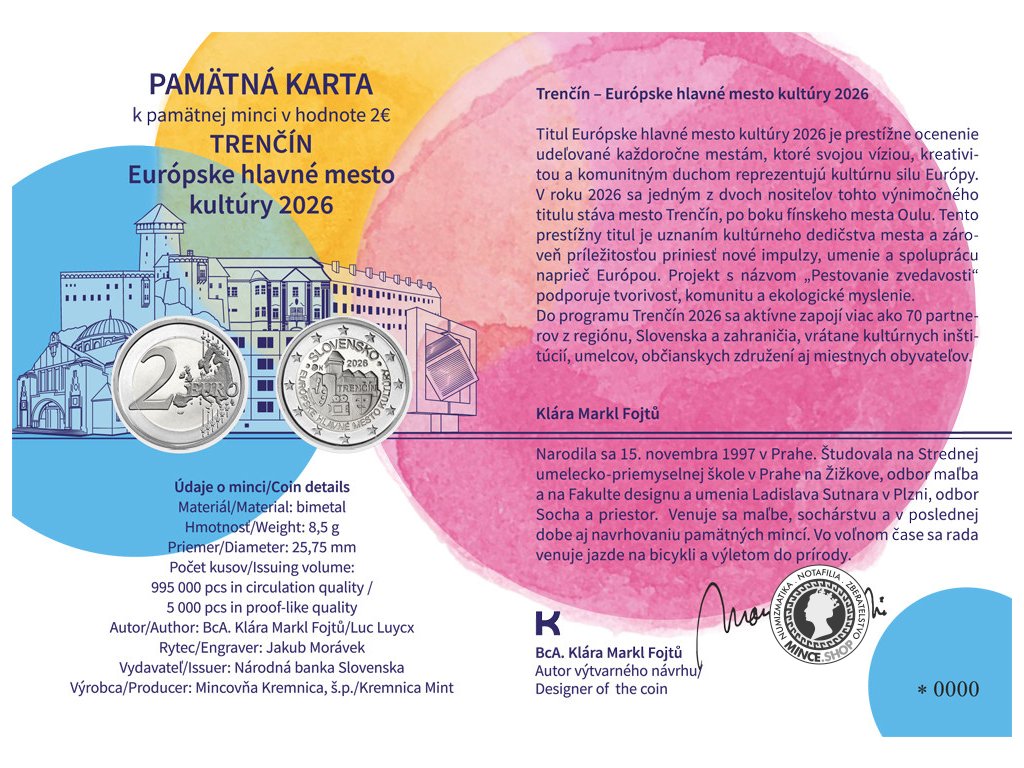 Pamätný list vydavaný pri príležitosti emisie 2€ pamätnej mince Trenčín – Európske hlavné mesto kultúry 2026.