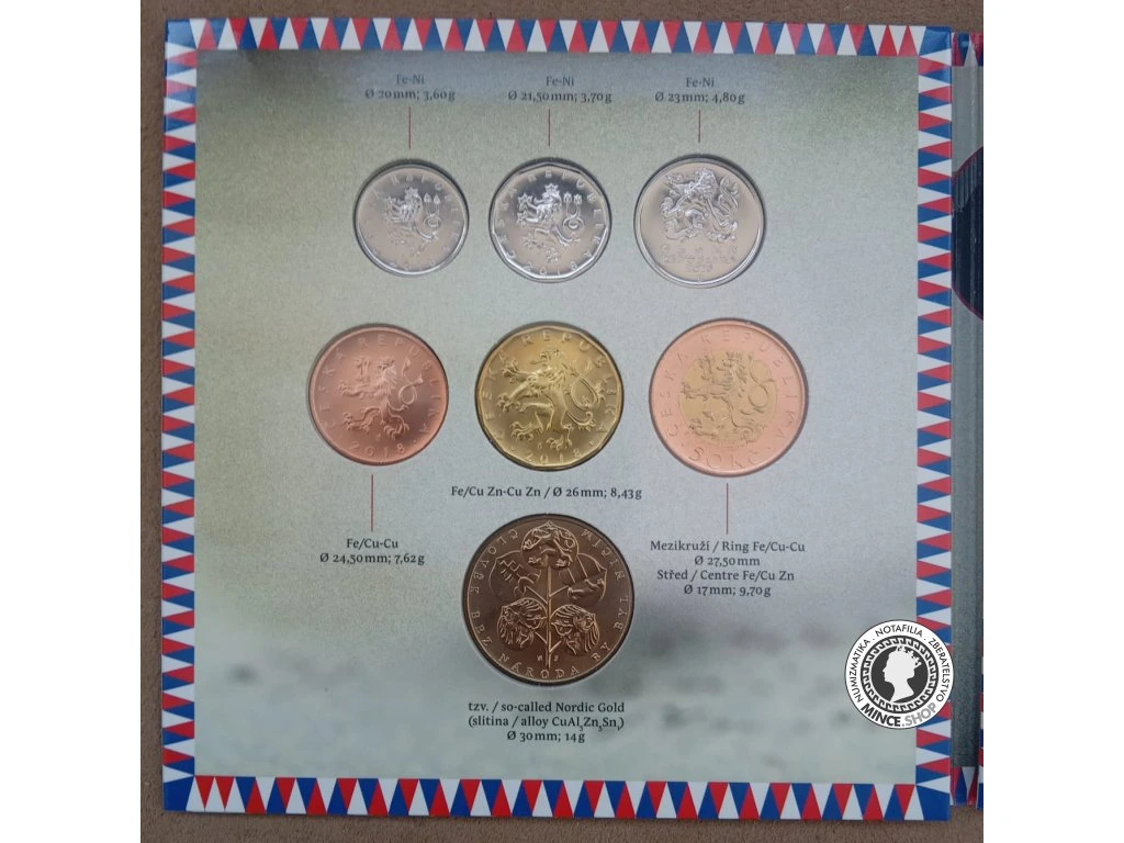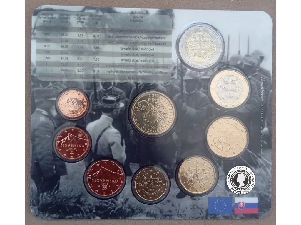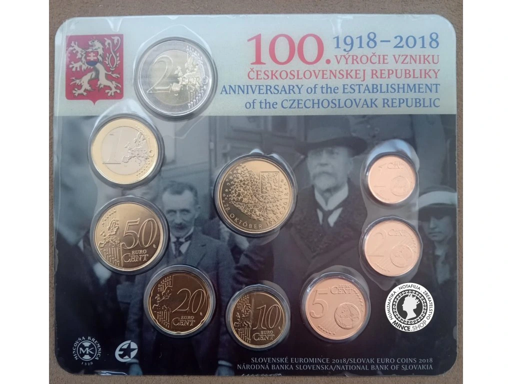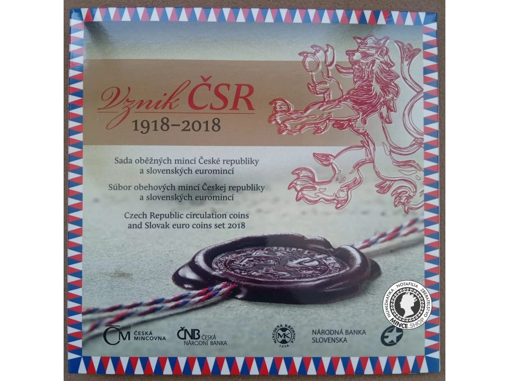 Sada mincí obsahuje obehové mince ČR a tematický žeton k 100. výročiu vzniku ČSR a obehové euromince SR vrátane tematického žetónu.